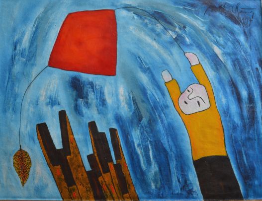 His style can be seen as naïve but he is also using lots of symbols: dice (the game of destiny), kites (flight to other hopes) golden leaves (the passage of time and loss of a wasted childhood). Bang is imbued with a deep nostalgia and great sadness.