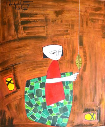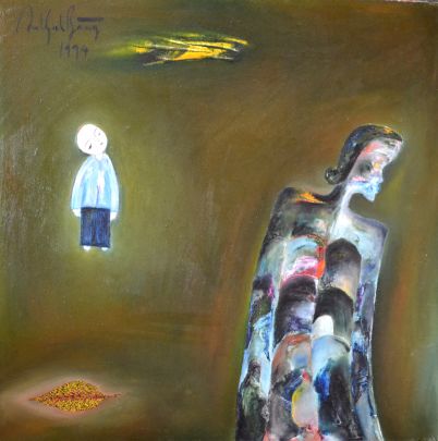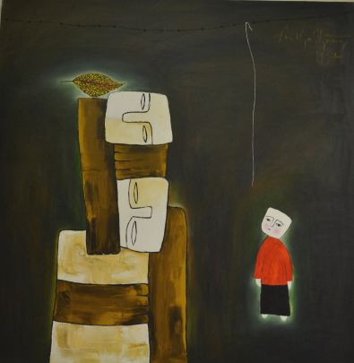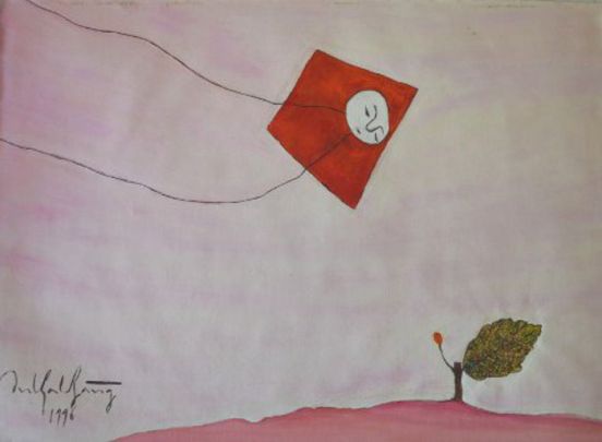 His style can be seen as naïve but he is also using lots of symbols: dice (the game of destiny), kites (flight to other hopes) golden leaves (the passage of time and loss of a wasted childhood). Bang is imbued with a deep nostalgia and great sadness.